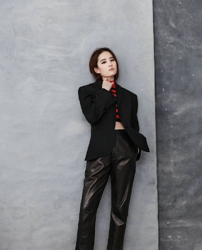刘亦菲以背头发型演绎黑色双排扣外套造型,眼神犀利,展现飒爽中性风范